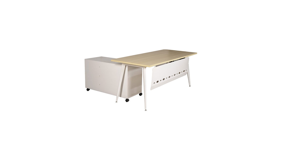 Bàn lãnh đạo cao cấp; Bàn sử dụng chân C10 kết hợp yếm sắt cắt họa tiết trang trí, sơn màu trắng S26; Mặt gỗ melamine cao cấp màu M14; Kích thước: W1800 x D800 x H750 mm.